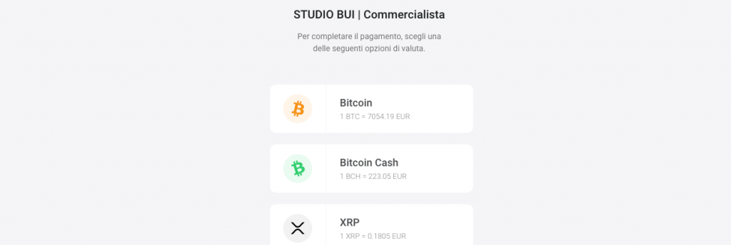 nella schermata che segue controllare che compaia l’intestazione dello Studio, quindi selezionare il wallet di criptovalute che si desidera utilizzare per il pagamento